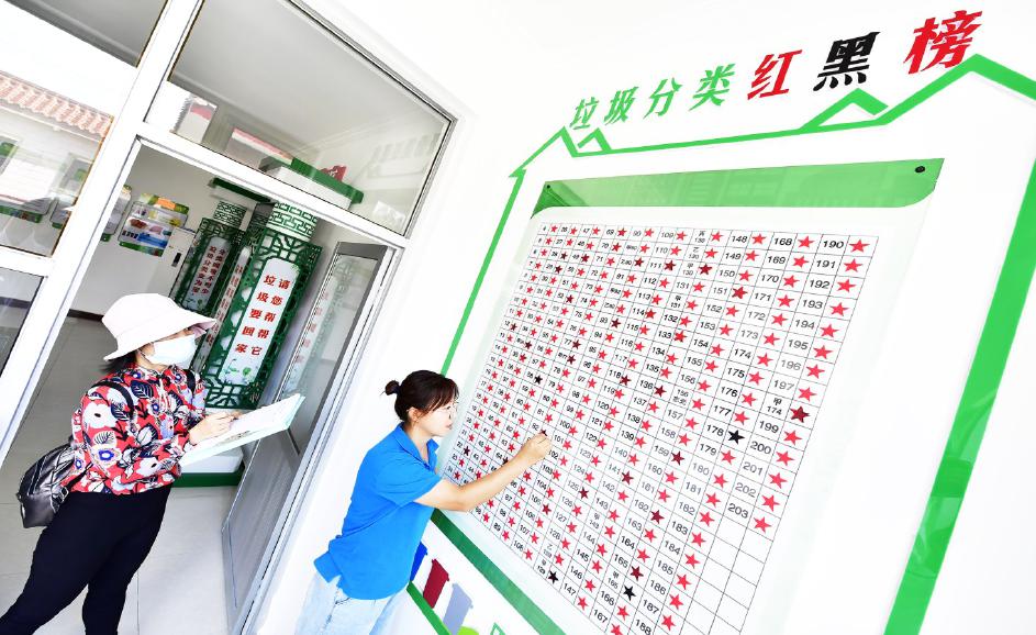 为提高垃圾分类正确率,富各庄村在村里10条街都设立了垃圾分类红黑榜,户户在榜、周周检查,分类正确的贴上红色五角星,不正确的贴上黑色的。