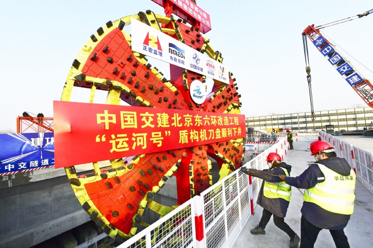 昨天下午,在东六环改造工程施工现场,两台履带吊联合进行抬吊、翻身作业后,顺利将“运河号”盾构机刀盘缓缓下放到始发井井底,待定位安装后,将开展管线联接、调试等后续工作,预计将于春节后始发。
