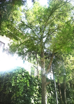 就在菩提广场,东侧一排绿树犹如卫兵夹道欢迎八方来客,甚至比菩提树还高。其中三株因为粗壮的树干脱颖而出,它们也是园区古树——桧柏,已经110岁了。