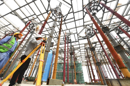 技术人员在指挥微调最后一面钢结构屋盖的高度。 记者 常鸣/摄