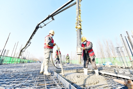 永乐店敬老院建设现场,工人正在进行混凝土浇筑施工。记者 唐建/摄