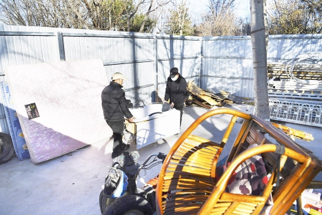 通典铭居小区工作人员正在清运暂存点里的大件垃圾。记者 党维婷/摄
