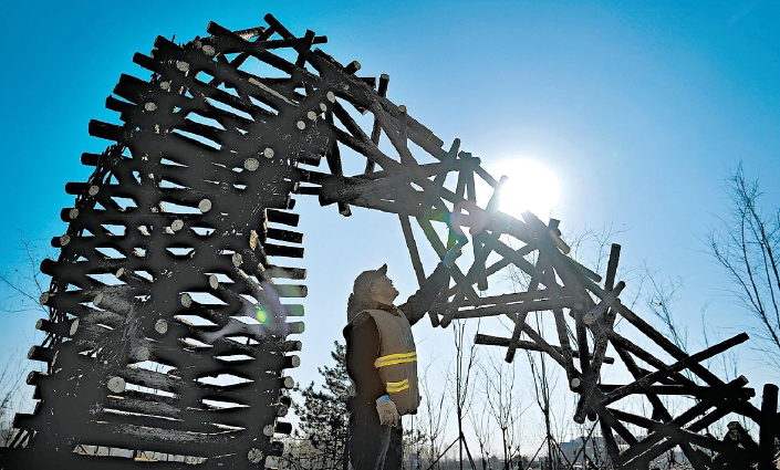 作品《秩序的重构》展现了混乱无序的枝条重塑为秩序统一的场景,从无序到有序,用园林废弃物塑造生态之美。记者 刘平/摄