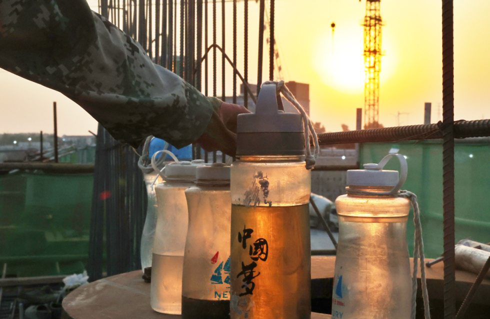 高温下的工地,水瓶是工人师傅除了工具外最重要的装备。
