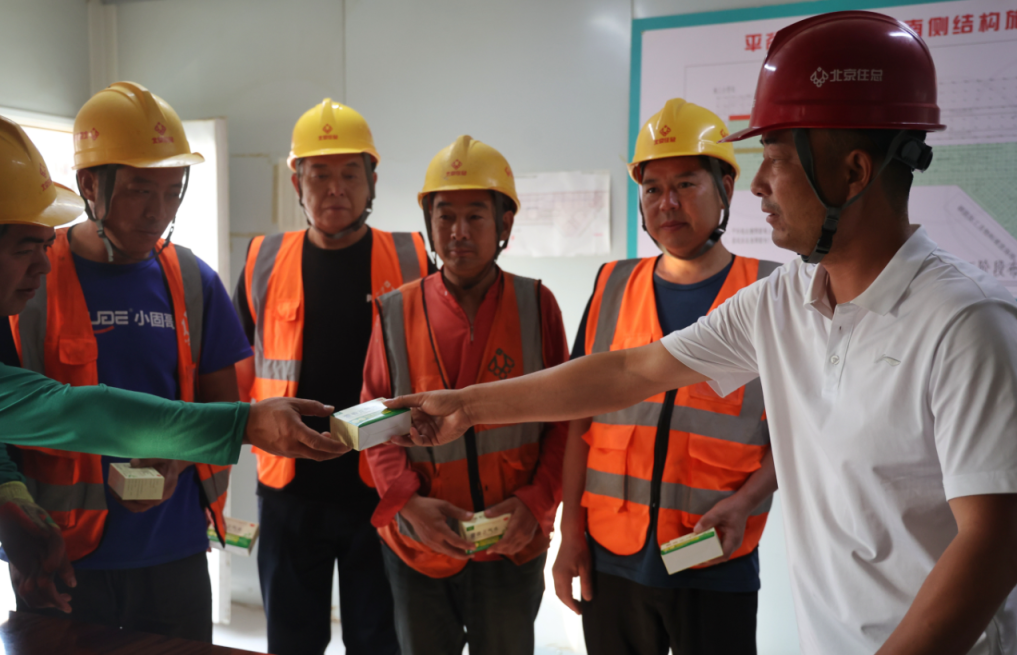 北京住总集团副中心站枢纽项目部现场工长李伟为工人师傅们发放藿香正气水等防暑物资。