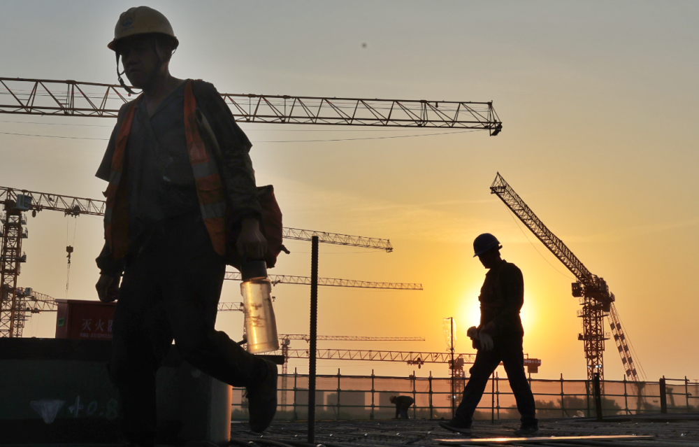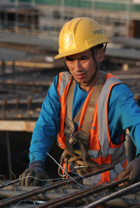 迎着初升的太阳,工人师傅们来到城市副中心站综合交通枢纽项目02标段的主站房屋顶,开始一天的工作。
