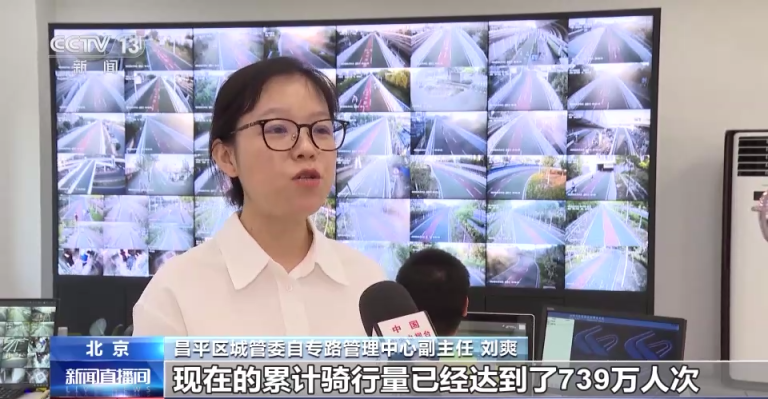 昌平区城管委自专路管理中心副主任 刘爽:现在的累计骑行量已经达到了739万人次,主要是满足了回龙观到上地软件园通勤的需求,同时也满足了一些周边骑行爱好者的休闲健身的功能,平常全面做好日常的秩序维护,清扫保洁,像路上会遇到一些突发的事情,都会有相应的人员进行及时处理。