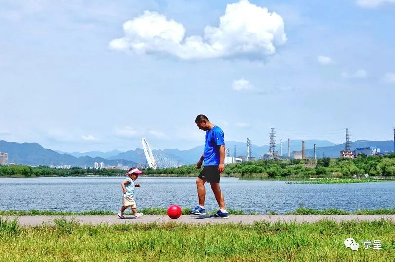 莲石湖畔,年轻的爸爸在教孩子踢足球。张齐摄