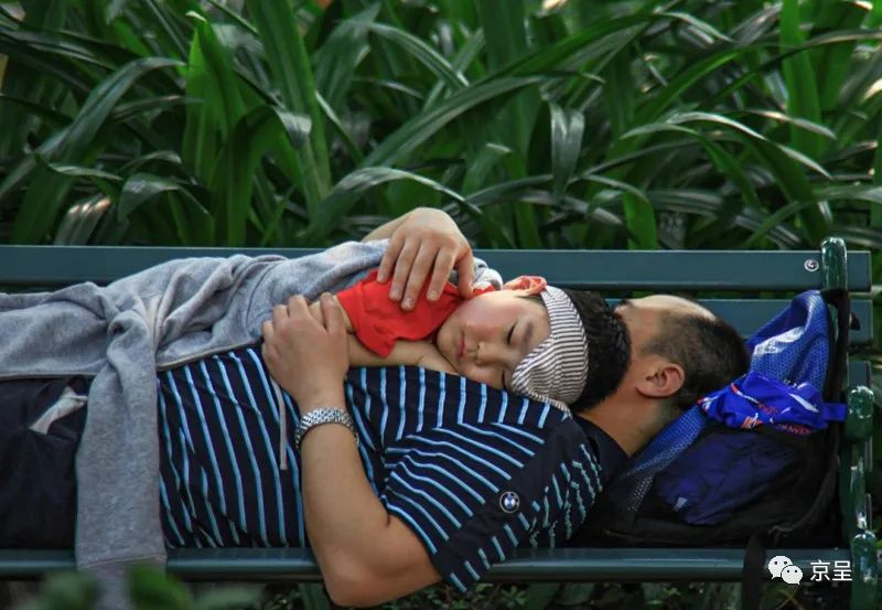 一起游园的父子累了,爸爸躺在椅子上,孩子趴在爸爸的胸前,安然入睡。敖德焕摄