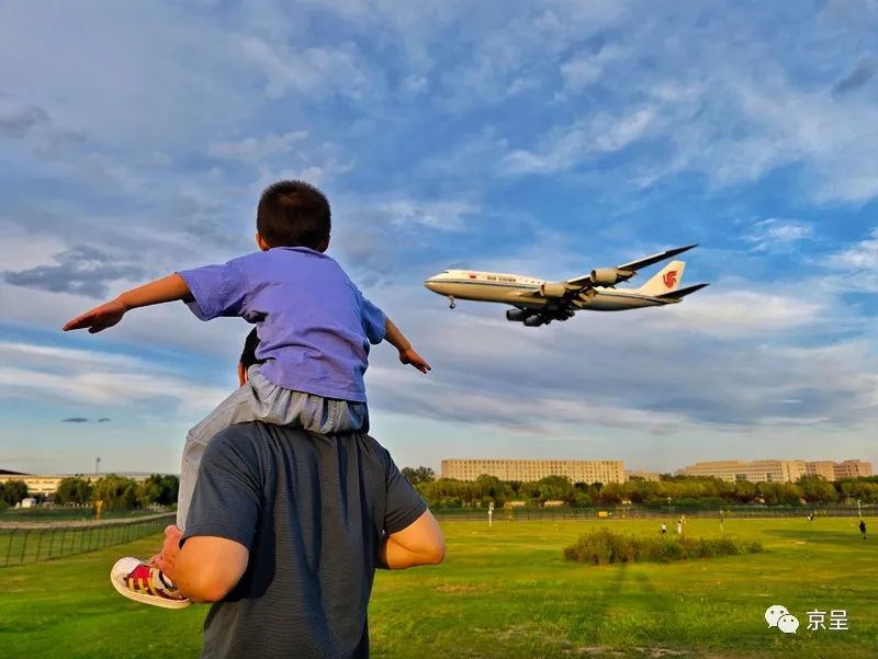 首都机场附近,父亲把孩子驮在肩上,孩子张开双臂,想象如飞机一样飞翔。柳峰摄