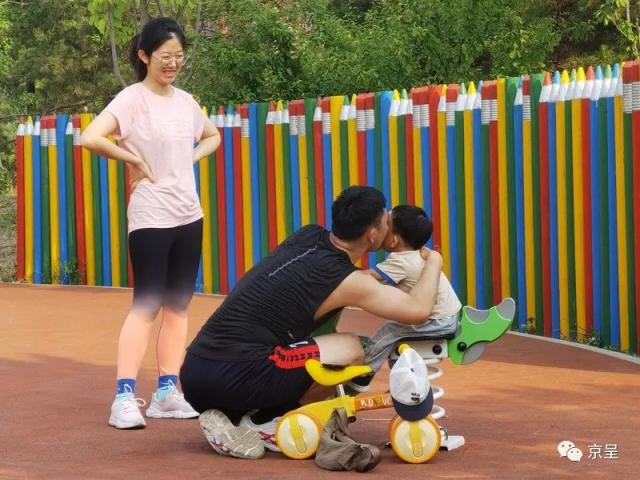 官庄公园,一家三口在儿童娱乐区,父亲在亲吻宝贝。韩梓旸摄