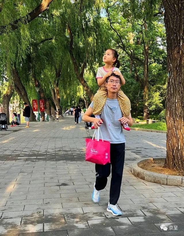 在玉渊潭公园里一位父亲让女儿坐在自己的肩膀上一起散步。耿卫红摄