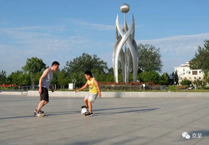 北京延庆区妫川广场,一对父子正在踢足球。赵粤来摄