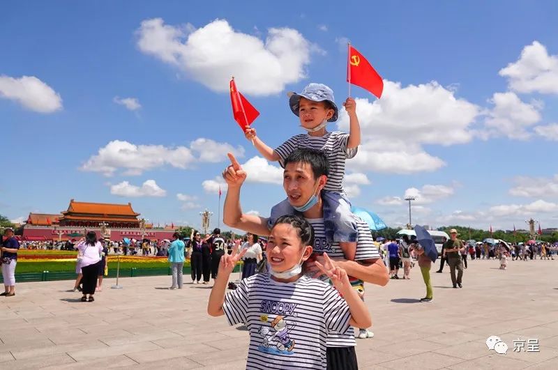 天安门广场上,父亲带着两个孩子一起参观。杨建军摄