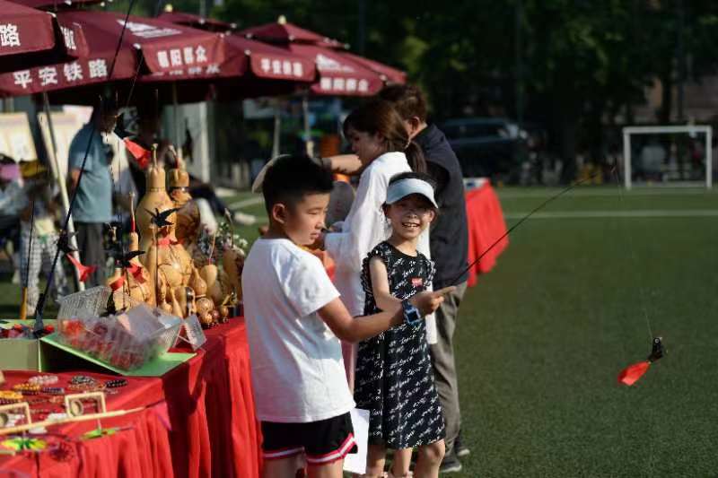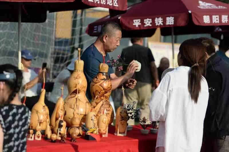 在文艺演出现场,三间房地区特别设置非遗作品展示区,让传统文化与非遗相碰撞,打造具有三间房特色的室外文化市集。在展示台上,葫芦镶嵌、毛猴、脸谱、北京面塑、风车、剪纸等作品琳琅满目,吸引居民参观互动。