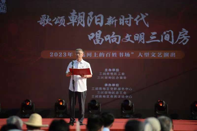 6月15日,运河上的百姓书场大型文艺演出在通惠河三间房河畔开幕。在“歌颂朝阳新时代 唱响文明三间房”的主题下,演出汇集三间房地区各界文艺爱好者,既有地区的文体队志愿者,也有来自辖区高校的学生,更有常年活跃在舞台上的专业演员,通过歌曲、舞蹈、评书、快板、相声等表现形式为观众带来一场夏日文艺盛宴。