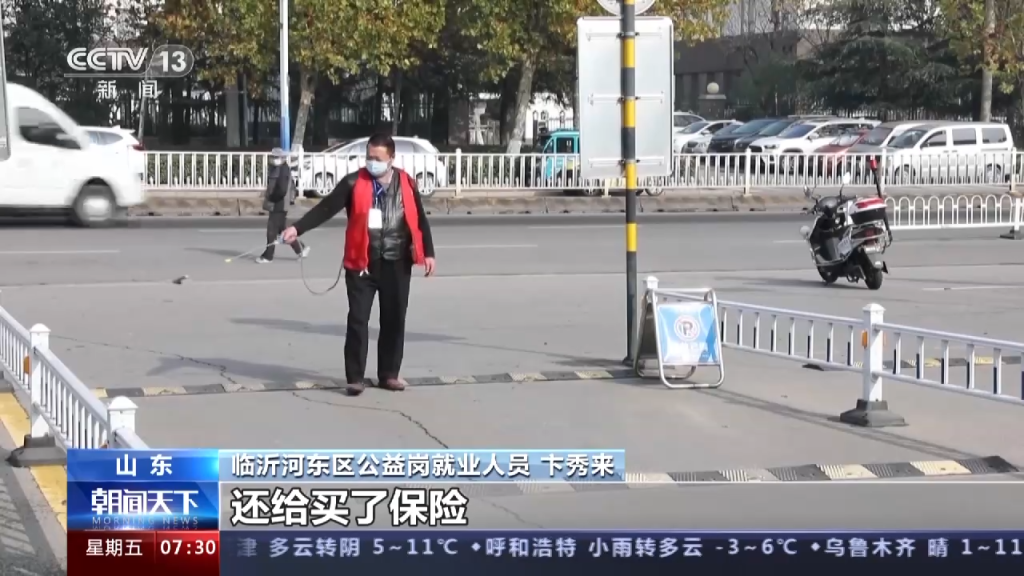 临沂河东区公益岗就业人员 卞秀来:在零工市场找到了这个公益性岗位,就帮忙维持下秩序,还给买了保险。