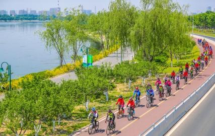 通州区北运河畔绿意盎然,不少骑行爱好者在河堤旁的绿道上愉快骑行。北京日报客户端记者武亦彬摄