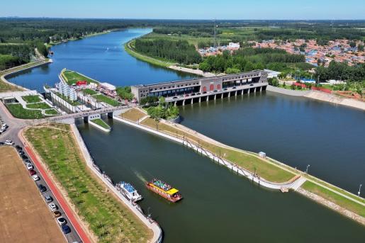 大运河京冀段62公里实现旅游通航。一艘驶出杨洼船闸的北京游船与准备进入船闸的河北游船在大运河上相会。北京日报客户端记者白继开摄