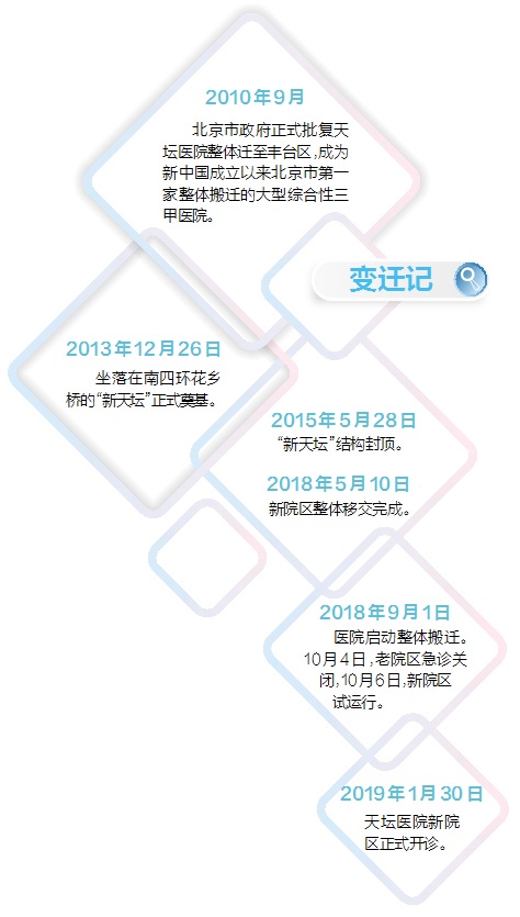 2013年12月26日,坐落在南四环花乡桥的“新天坛”正式奠基;2018年9月1日,医院正式启动整体搬迁;2019年1月30日,北京天坛医院新院区正式开诊。