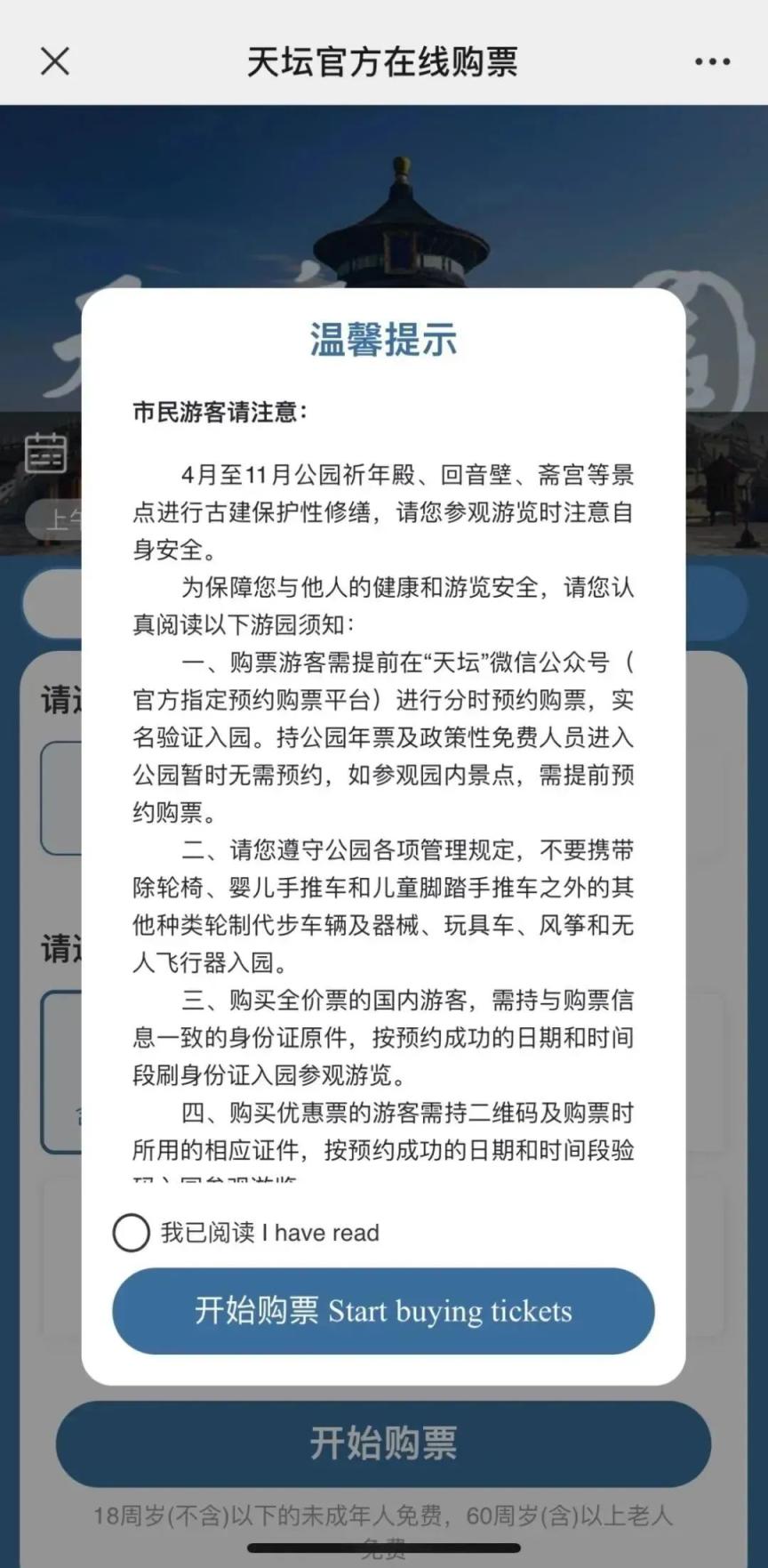 天坛公园温馨提示:来园游览前请提前关注“天坛”微信服务号,了解网上预约票销售情况,合理安排出游计划,错时错峰游览。倡导选择公共交通绿色出行,在游园过程中,严禁吸烟,保护文物,请自觉维护公共游览环境,文明游园。