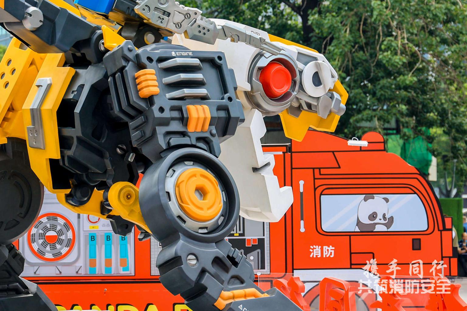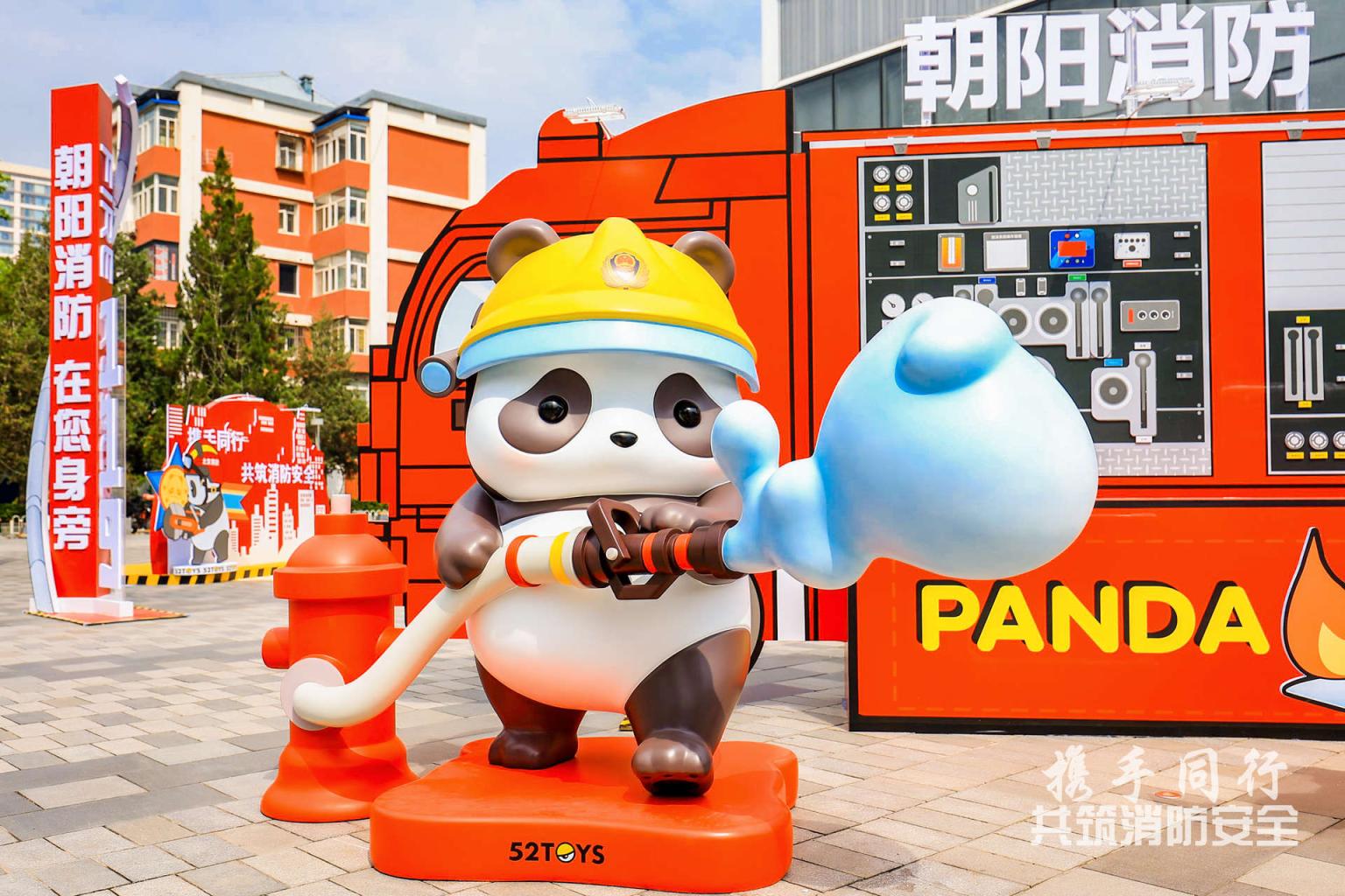 “爸爸,那是大熊猫消防员吗?它在喷水灭火!”上午10点刚过,消防主题展就吸引了不少路人,尤其是家长和小朋友的驻足观看。记者在现场看到,展览共有“三区九模块”,其中最吸睛是52TOYS原创机甲变形系列BEASTBOX狄奥DIO和治愈系IP-PandaRoll等卡通形象,以及巨型灭火器、消防车等模型,来往市民纷纷打卡拍照。