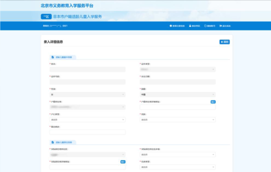 学校预登记完成并提交区教委审核通过后,适龄儿童家长方可登录平台查看到入学情况。
