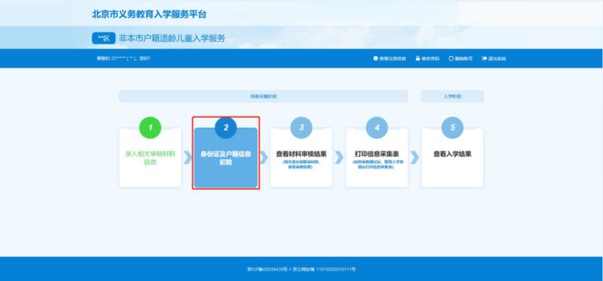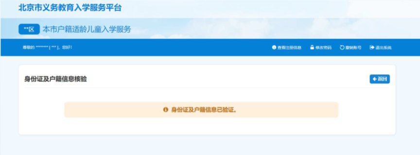 用注册时生成的账号和密码登录“本市户籍适龄儿童入学服务”后,点击导航栏中的“身份证及户籍信息核验”查看信息核验状态。如图10所示: