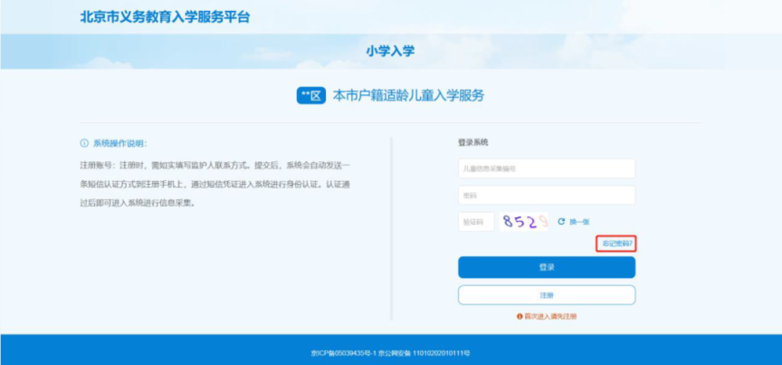 进入”本市户籍适龄儿童入学服务”登录页面,点击“忘记密码”。如图15所示:
