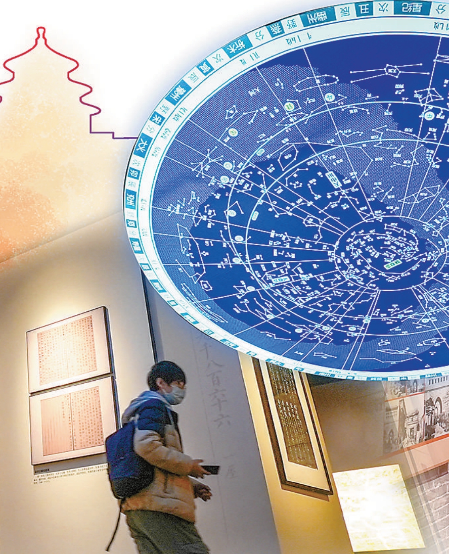 走进“方志北京”展厅,首先映入眼帘的就是蓝色穹顶上绚烂的析木次星图,地面对应的则是析津府辖域图,这其中蕴藏着现存最早的北京地方志《析津志》名称的由来。