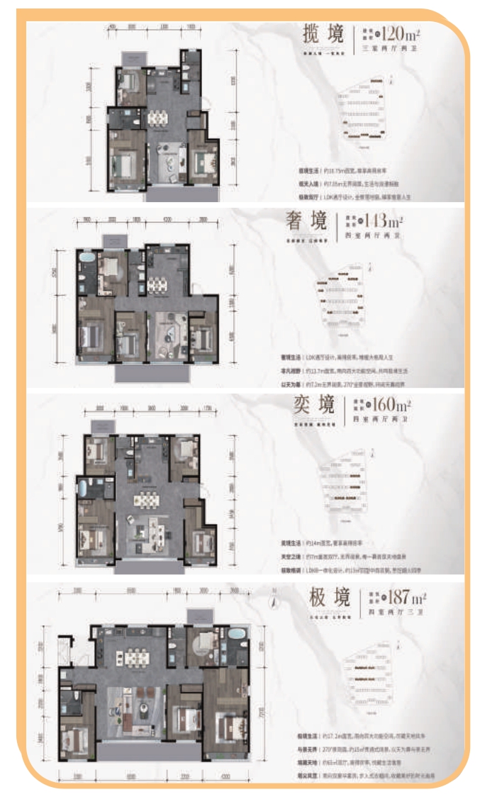 项目包括建筑面积约120平方米、143平方米、160平方米、187平方米四个户型,无论是尺度感还是空间规划,均领先于目前市场上相近面积段的户型设计。