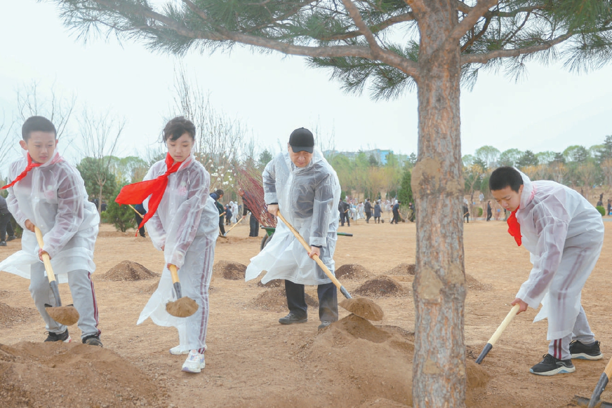 昨天,习近平等党和国家领导人冒雨来到北京市朝阳区东坝中心公园参加首都义务植树活动。这是习近平同大家一起植树。新华社发