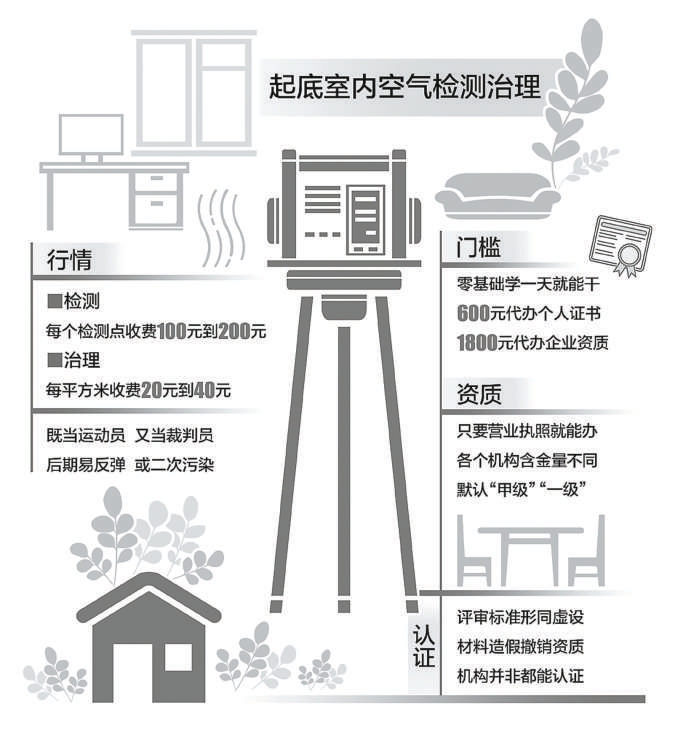 然而,记者调查发现,室内空气检测行业鱼龙混杂,这些“专业机构”的所谓资质证书水分很大。只要钱花到位,专业资质就能轻松到手。
