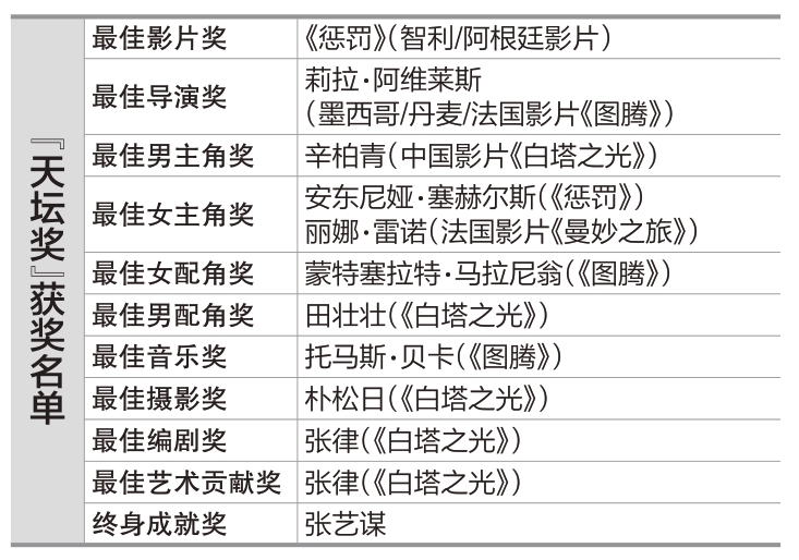 第十三届北京国际电影节昨晚在怀柔雁栖湖落下帷幕,“天坛奖”十大奖项一一揭晓。智利/阿根廷影片《惩罚》获最佳影片奖。女导演莉拉·阿维莱斯凭借《图腾》获最佳导演奖。中国演员辛柏青凭借《白塔之光》获得最佳男主角奖,安东尼娅·塞赫尔斯和丽娜·雷诺分别凭借《惩罚》和《曼妙之旅》获得最佳女主角奖,这也是北影节首次颁出双最佳女主角奖。