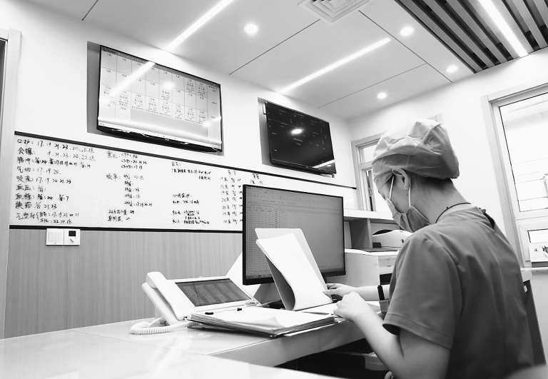 来到高碑店社区卫生服务中心3层,最亮眼的是安装在护士站大大小小的屏幕。有的屏幕上显示着老人的基本情况、病因病史、护理信息、医嘱信息等;有的屏幕上则实时显示着老人的心率、血压等各项监测情况。“老年护理中心是一个‘智慧病区’。”中心主任王辉说,这里也是中央监护系统,通过这些屏幕,在护士站就能实时观察老人在病房里的情况,一旦老人有情况,护士站能及时发现,直接呼叫医生。