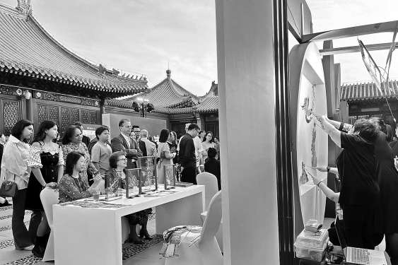 活动现场充满了浓浓的文化气息。东城区精心准备了京剧《天女散花》、舞蹈《水墨舞韵》《戏武英姿》等文艺表演,让外宾们感受中国传统文化之美。尤其是现场展示的纸艺文创、景泰蓝制作、北京兔儿爷等非遗项目,吸引了大家的注意力。一些外宾饶有兴致地了解非遗工艺原理,和非遗传承人一起动手制作。皮影戏《龟与鹤》演出时,外宾们看得目不转睛,演到高潮处,大家纷纷拿出手机记录精彩瞬间。