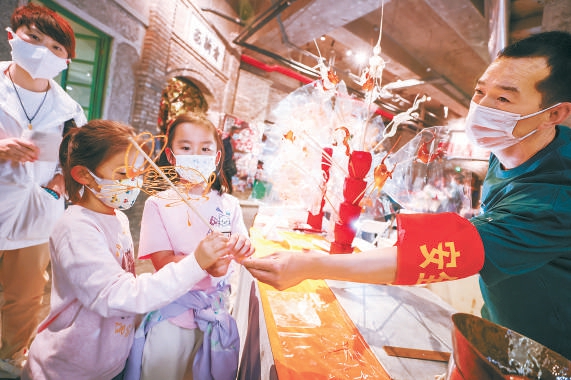 走进胡同,游客们又被各种叫卖声吸引。北京正明圣达老北京叫卖艺术团的团员们变身走街串巷的小商贩,带来老北京叫卖表演。吹糖人、拉洋片、皮影戏等各类非遗体验也分布在胡同各处,手艺摊位带来烙画葫芦、毛猴、景泰蓝、泥塑等,让人们近距离了解传统手艺。胡同深处还设置了一片艺术墙,讲述北京胡同的历史。“第一次见到这么丰富的民俗表演,太有意思了!”崔女士带着10岁的女儿来游玩,充满烟火气的市井生活让母女俩流连忘返。