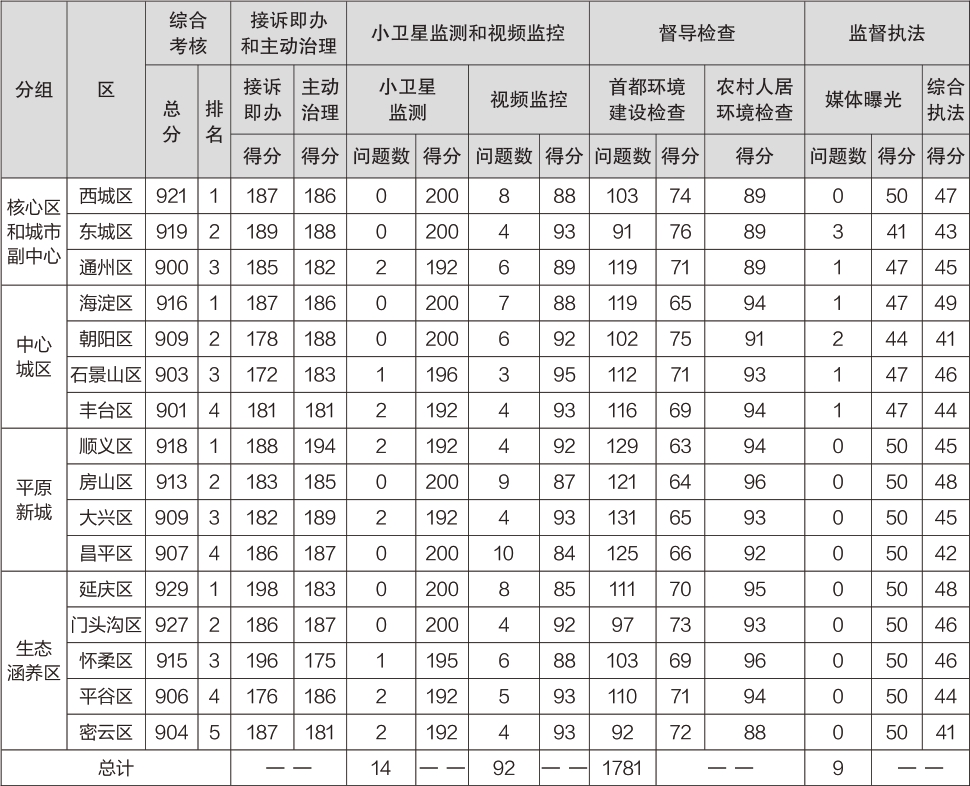2023年3月份,首都环境建设管理办围绕接诉即办和主动治理(400分)、小卫星监测和视频监控(300分)、督导检查(200分)、监督执法(100分)四个方面,采取千分制扣分开展考核,并按综合考核得分进行排名。