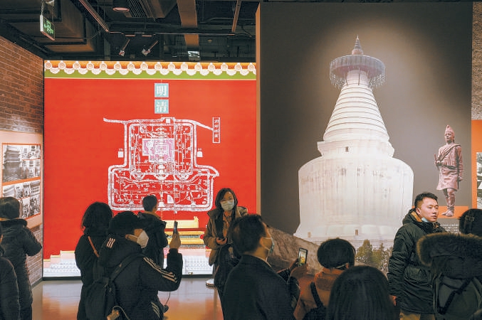 展厅中,293册志书层层摞放,巧妙地拼组成“京”字和天坛图案;栖息在古建筑上的北京雨燕飞越古今,成为北京中轴线的活态遗产;天棚藤架、石桌石凳、鸟笼等四合院的经典元素,彰显着北京胡同的独特韵味;蓑衣城墙遗址模型展现了古人保护元大都城墙的智慧……