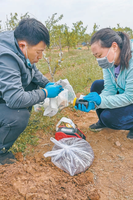 土壤样本采集人员在平谷区的一处土壤环境监测点进行现场采样。在样品袋的外面贴着一张土壤样品“身份证”,写明样品编号、点位名称、采样地点、经纬度数据、采样深度、采样类型、土地利用类型和采样日期等信息。