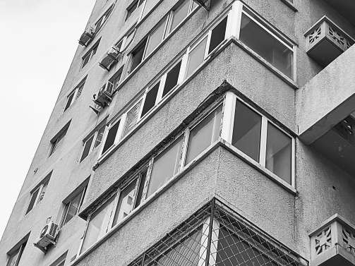 慧忠北里三塔楼小区,可见不少居民阳台窗沿损坏。
