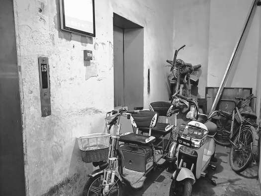 新景家园东区2号楼单梯运行的楼道堆满车辆。