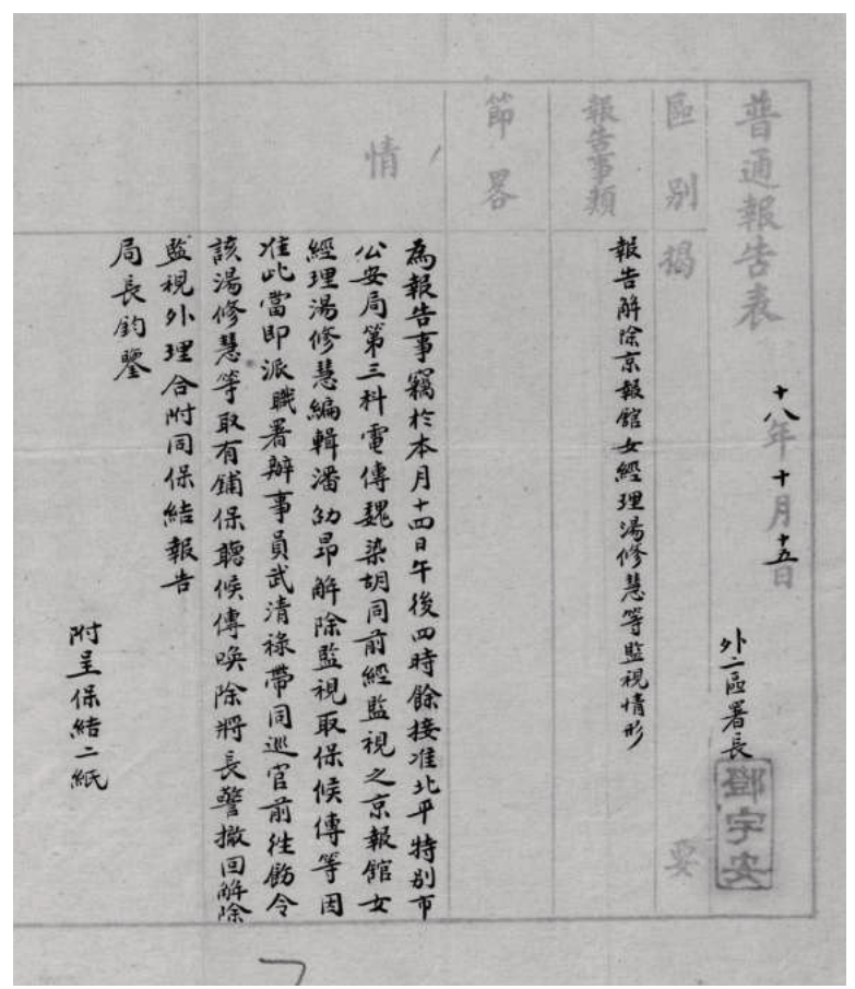 1929年10月15日,京师警察厅解除对汤修慧等人监视的报告。