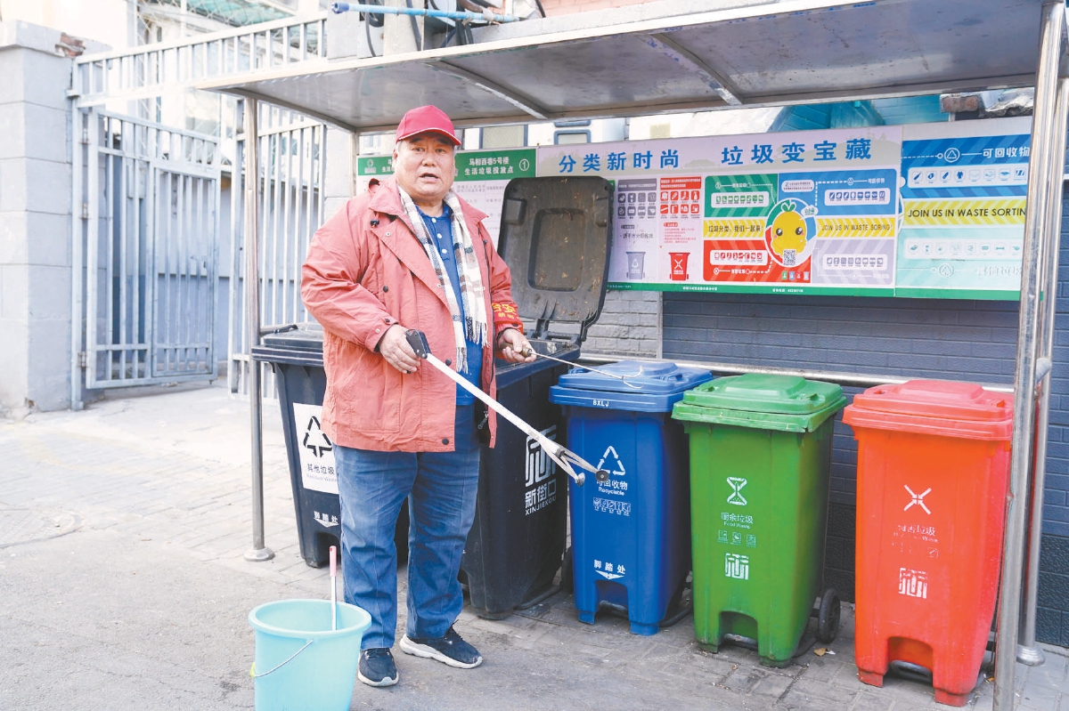 这两年,我当上了小区的垃圾分类普法宣传监督员。早上7点上岗,值守俩小时;晚上6点到8点,再值守俩小时。家门口的垃圾桶,每天我都拿小刷子洗得干干净净。看见有人不分类扔垃圾,我都得提醒他们。