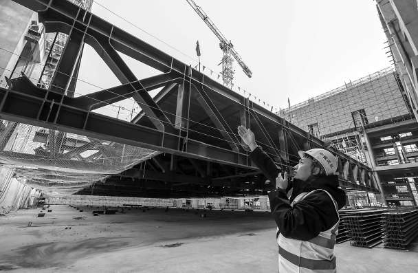 在会议中心主会场施工现场,记者刚入场就看到由9榀桁架组成的提升单元悬在半空中,仔细一看,“大块头”正缓缓稳步上升。