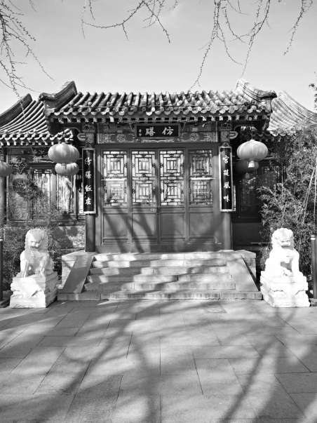 在饭庄大门的两侧门框上,各嵌着一块黑底金字的匾额,上书“仿膳”,落款:老舍。据说当初仿膳负责人想请郭沫若先生题匾,郭老谦虚地说:“我的字太狂草了,老舍是旗人,他的字写得规矩,给仿膳题匾最合适。”郭老说得颇有道理,老舍先生的作品写的都是北京的人和事,他还是当时的北京文联主席,因此他是最佳人选。于是老舍题下刚劲浑厚的两个大字,这也是他一生中题写的唯一一块商号匾牌。