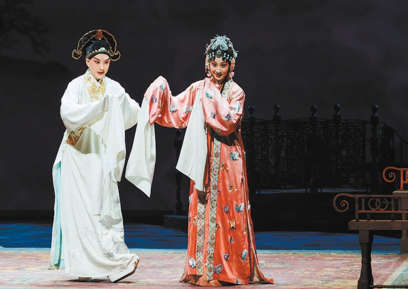 最让人惊喜的,还是扮演全部三本杜丽娘和柳梦梅的两位青年主演,罗晨雪、胡维露不负众望,台风大气,表演细腻,多次赢得现场观众热烈掌声。特别值得一提的是,上昆全本《牡丹亭》和大多数版本不同之处,还在于“柳梦梅”由女小生担纲。上昆有着女小生的传承,此次扮演“柳梦梅”的胡维露师承著名表演艺术家岳美缇,昆剧大师蔡正仁也专门给胡维露说戏抠细节。无论团方还是导演,都希望将昆曲中的“女小生”这一美学传统延续下来、不要断代,而胡维露此次表现确实得到了众多戏迷和专业人士的认可。