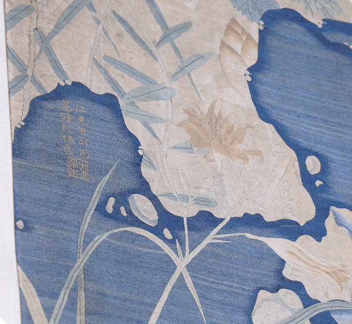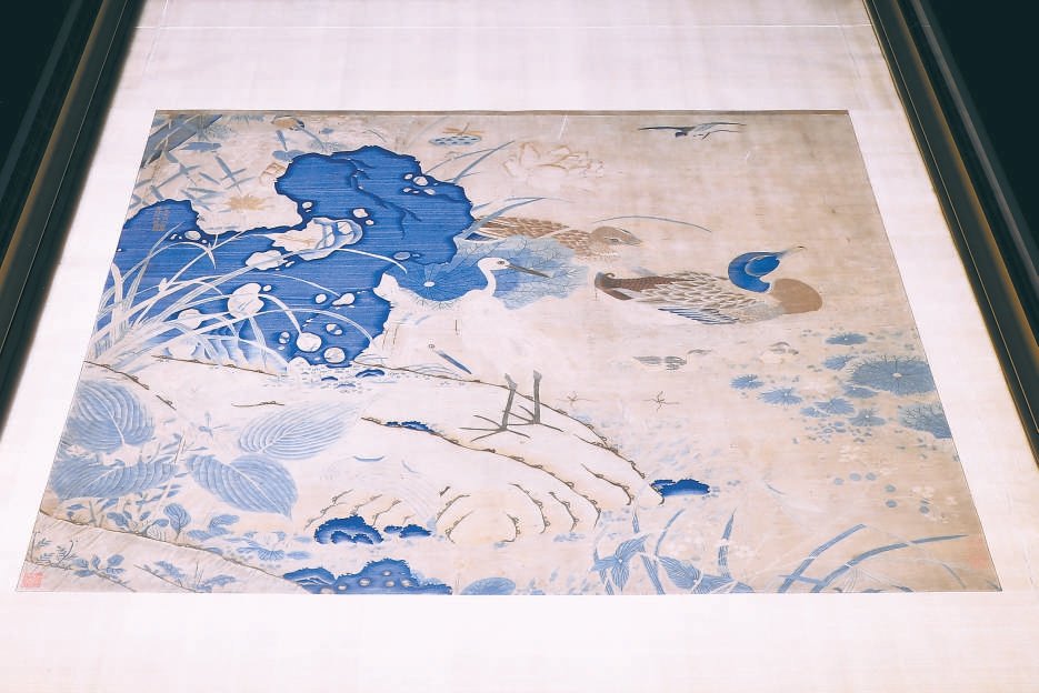 本次展出时,《莲塘乳鸭图》平放在展厅最重要的位置。它是一幅高宽皆超过一米的缂丝大作,以彩色丝线织成,主题是江南的莲池景色。画面中间右侧有双鸭相游,下边有一对乳鸭相随。坡岸上有青石矗立,似乎是假山,上面有作者的题款“江东朱刚制莲塘乳鸭图”,印文为“克柔”,是作者的字,所以后人也称他朱克柔。画面上点缀着白鹭、翠鸟、蜻蜓、水黾等动物,周围有荷花、木芙蓉、百合、慈姑、白莲、萱草、玉簪和芦苇等花草环绕,生趣盎然。这幅画的季节背景很清晰,莲花是夏天的植物,乳鸭常见于六月底到七月中,木芙蓉的颜色一日三变,从白变粉,画面上半白半粉的木芙蓉说明这是上午快到中午的时候。