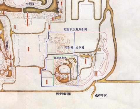 乾隆三十二年(1767年)开始,乾隆帝将康熙年间原本不足200亩的熙春园向东、北扩建至800亩左右。这里需要提及一下新旧熙春园的演变历史。乾隆扩建熙春园后,到了嘉庆年间,嘉庆帝将原熙春园与新熙春园相通的砖门封闭,把原熙春园更名为近春园并赐出;扩建的新熙春园部分则留下“熙春园”之名,是嘉庆御园。道光初年,熙春园和近春园被同时分赐给惇亲王和瑞亲王成为赐园。咸丰初年,咸丰帝给熙春园题匾“清华园”,从此熙春园更名为清华园。也就是说,清华大学南北支河这一带,清代时是三山五园最东侧的皇家园林。