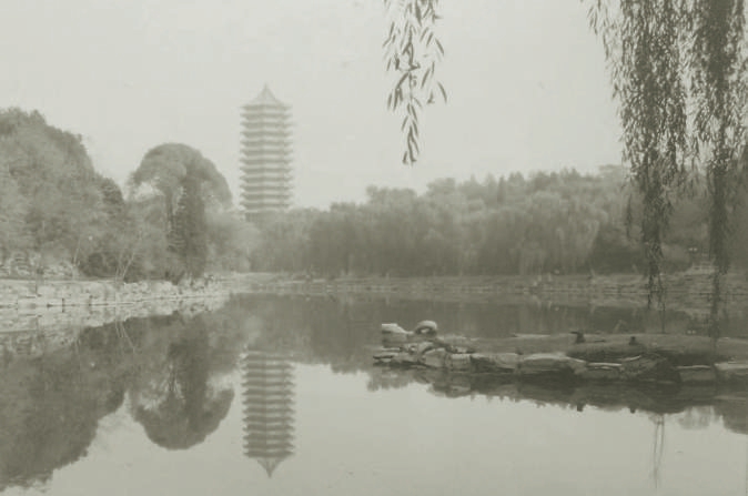现如今,从古色古香的北大西校门进入“燕园”,迎面而来的便是“泮池”,跨过一座三孔石桥,便来到了由物理楼、办公楼、外文楼围合而成的广场。走过广场,从办公楼北经过岗峦起伏、林木深幽的土山,便进入了“燕园”最具标志性的景物——“一塔湖图”。